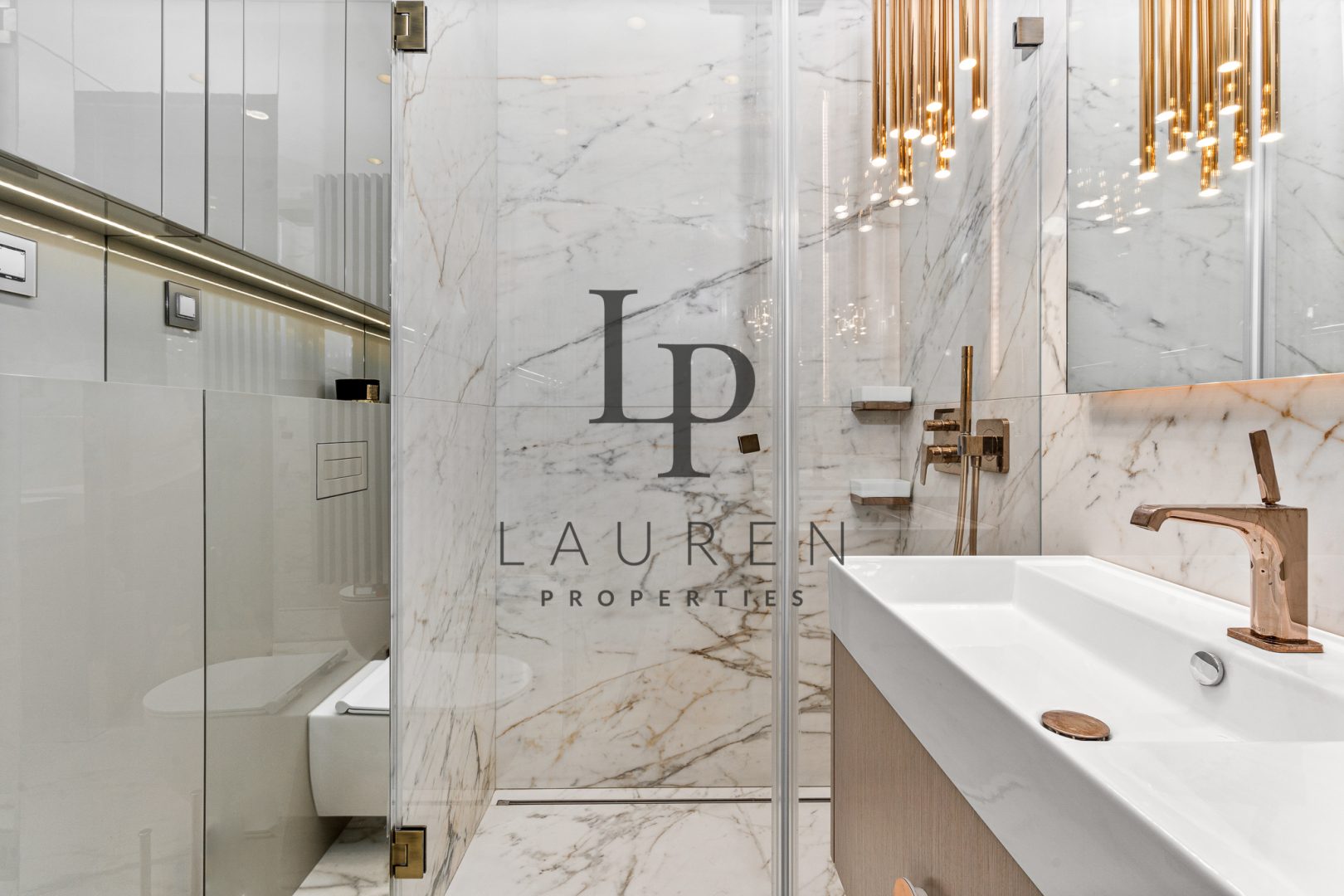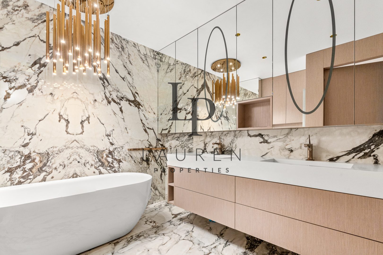 Łazienki wykończone marmurowymi płytami Breccia Capraia oraz Calacata z ceramiką i armaturą najwyższej jakości.