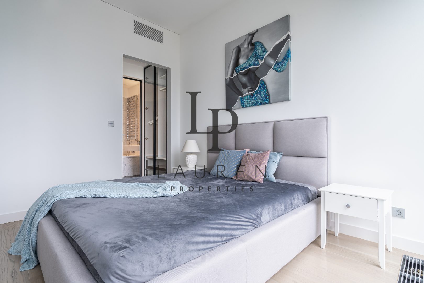 Stylowa sypialnia z garderobą i oddzielnym wejściem do łazienki, która podzielona jest na dwie części. Wanna z prysznicem i umywalką, oddzielona szklanymi drzwiami od toalety z pralką i suszarką w zabudowie.