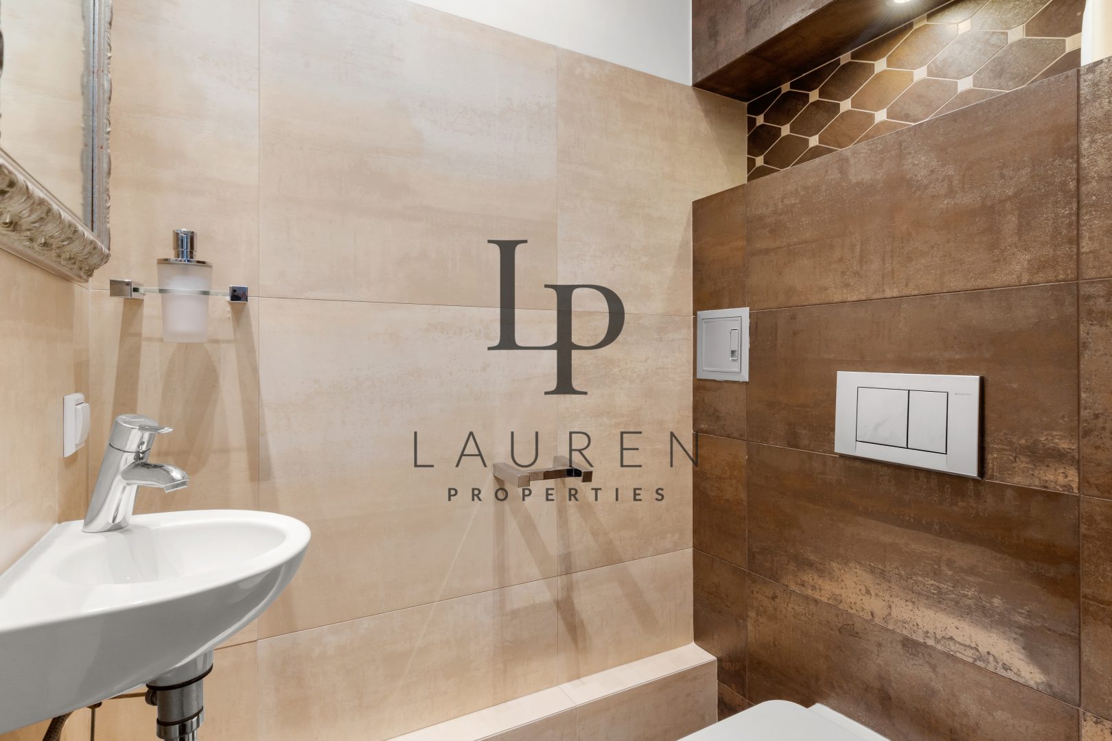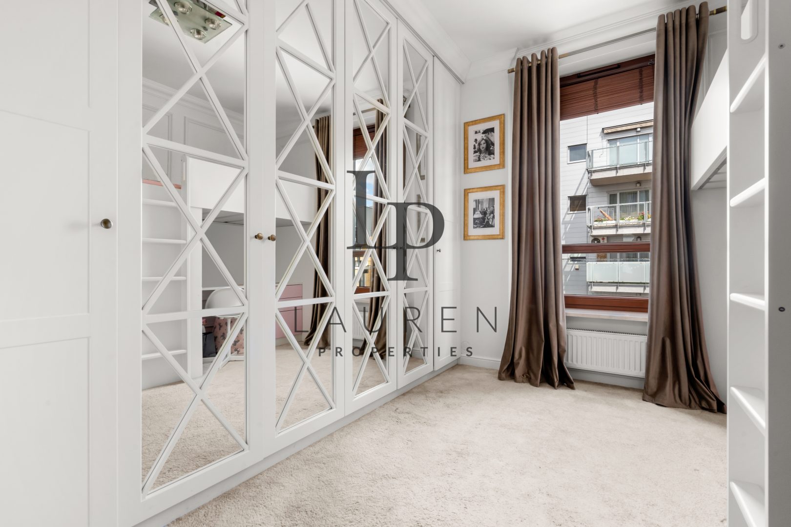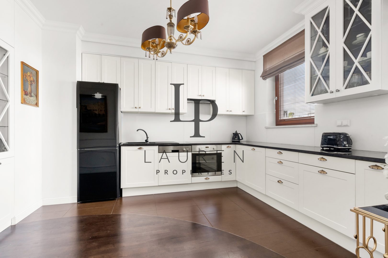 Starannie zaprojektowany oraz wykonany z najwyższą jakością. Stylowa sztukateria na ścianach oraz suficie dodaje elegancji całemu wnętrzu. Stolarka z kuchnią i obszernymi szafami w zabudowie została wykonana na indywidualne zamówienie. Charakteru dodają wiszące lampy cenionej polskiej marki Kutek.