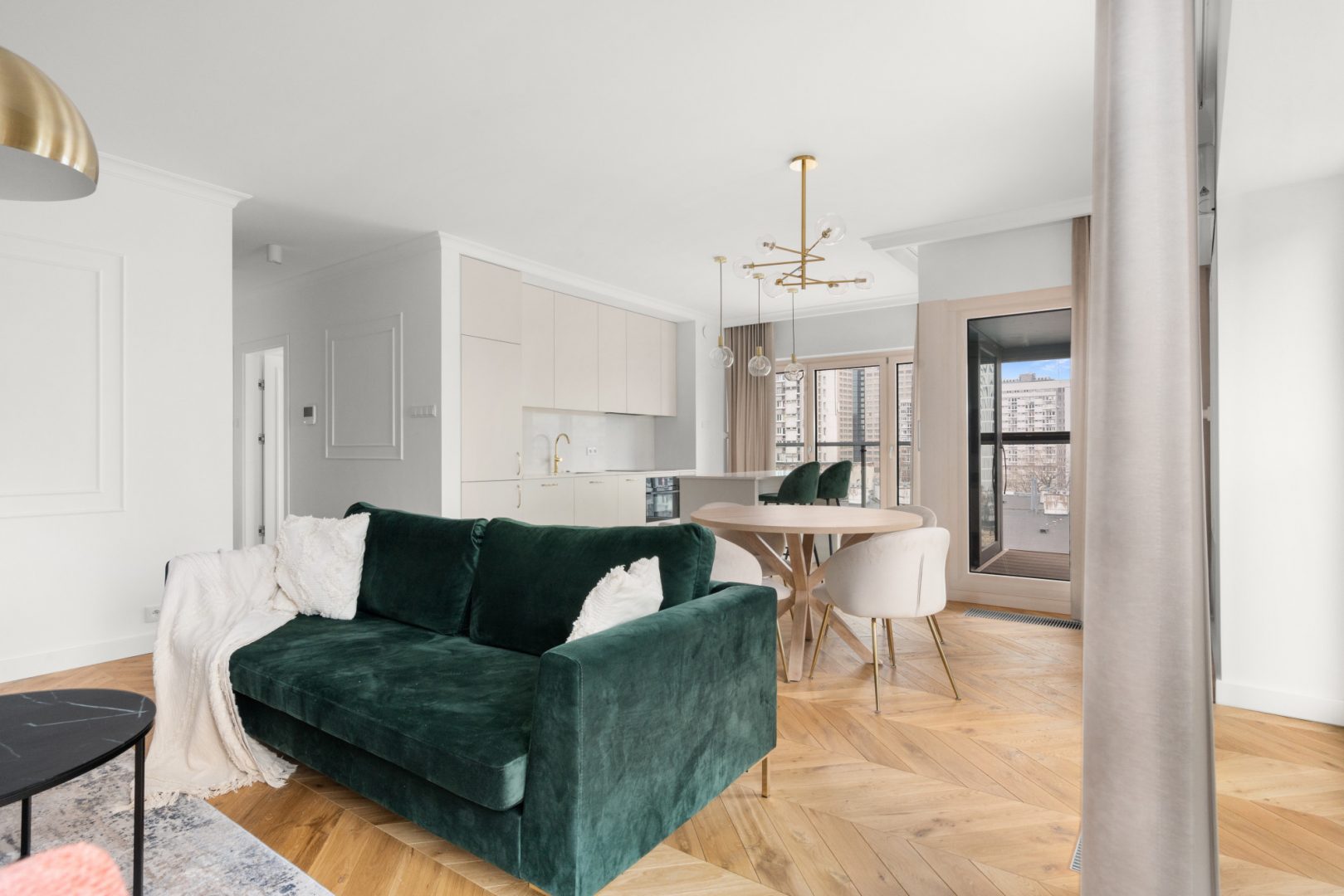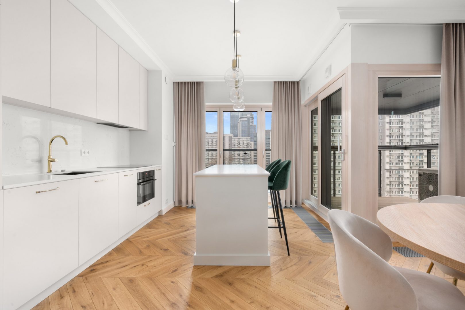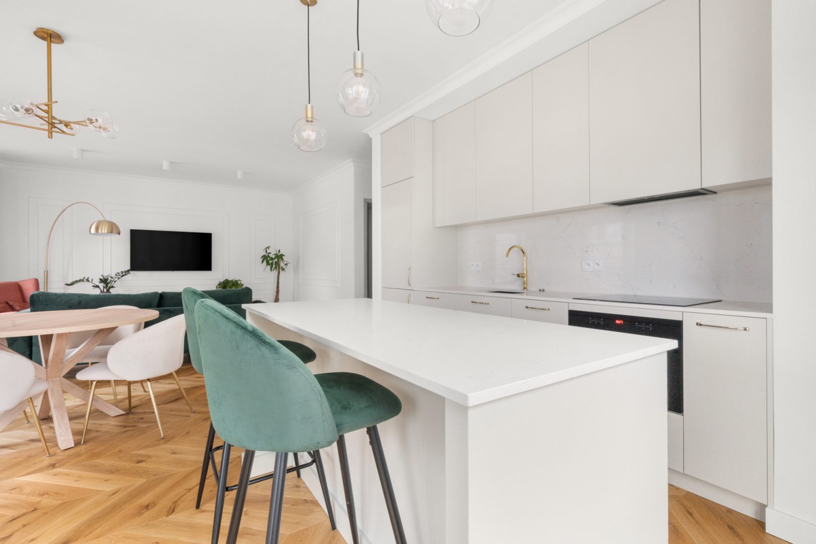 – otwarta w całości na salon z wygodną wyspą, wyposażoną w niezbędny sprzęt AGD wysokiej jakości.