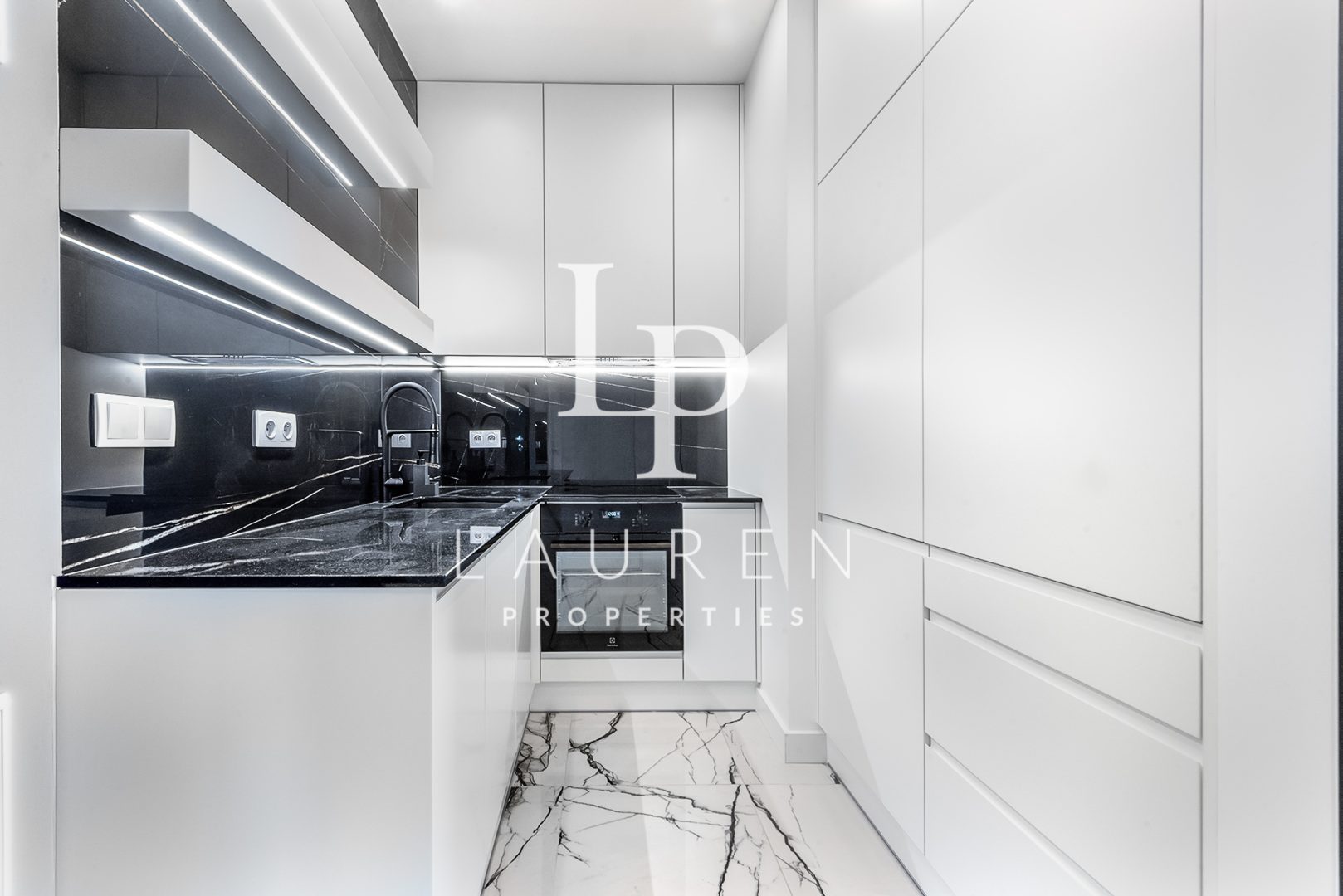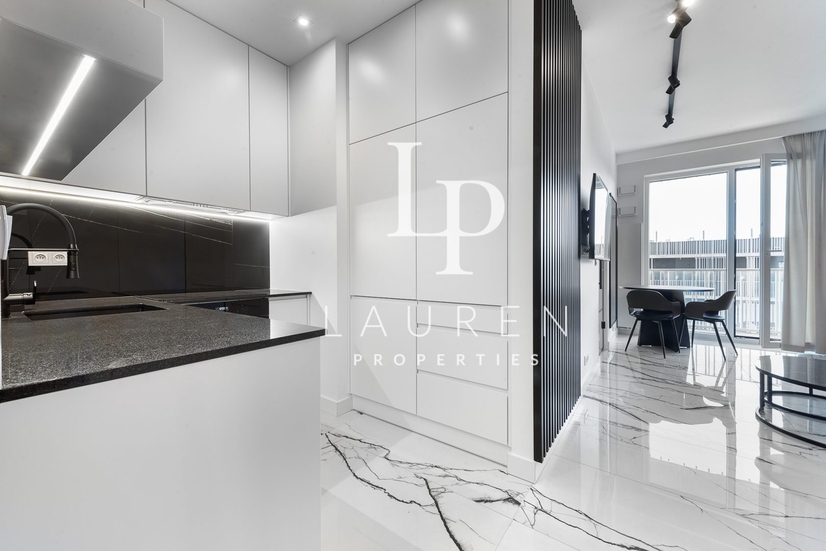 – Designerska kuchnia tworzona na zamówienie, wyposażona w niezbędny sprzęt AGD: lodówka w zabudowie, płyta indukcyjna, piekarnik oraz zmywarka.