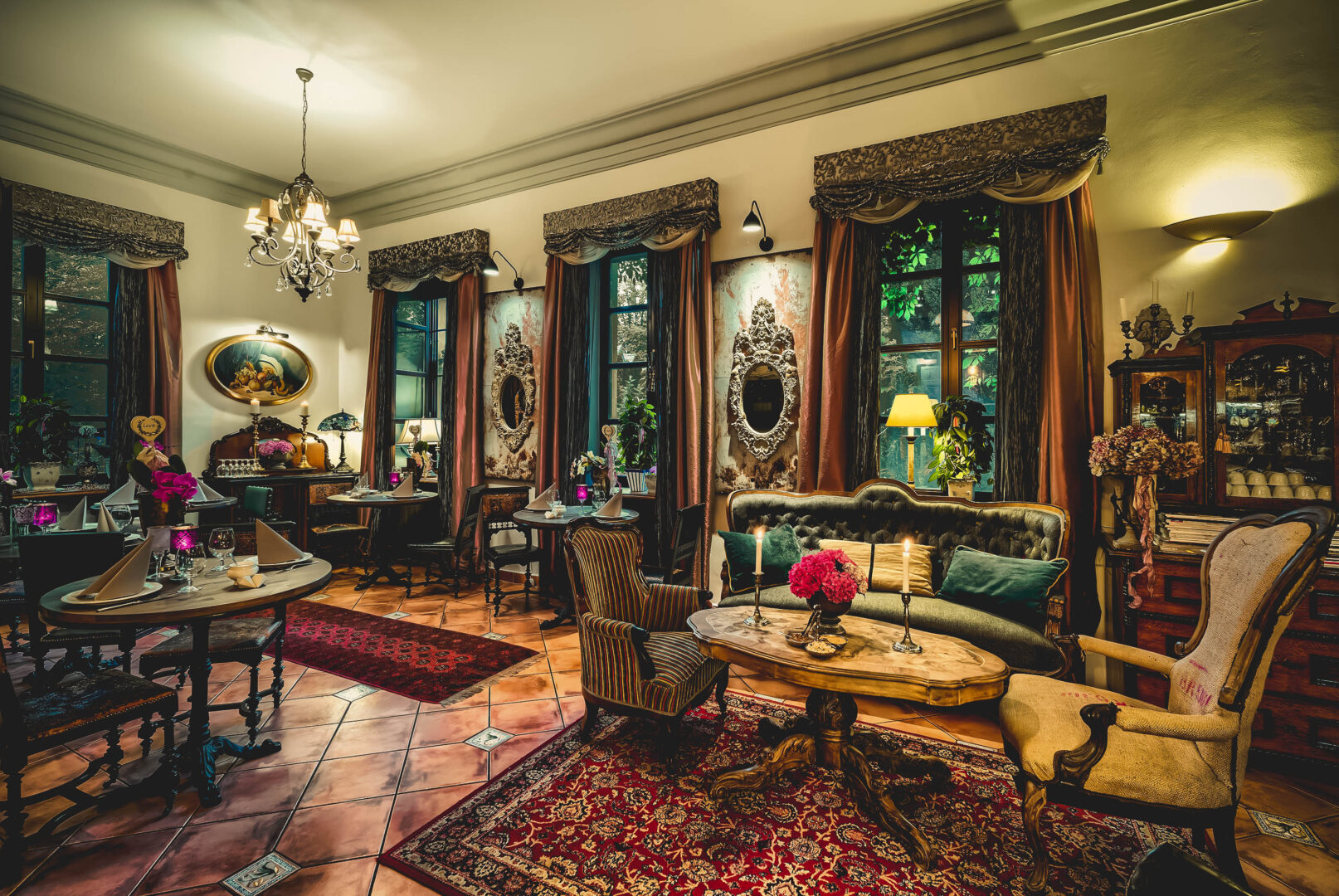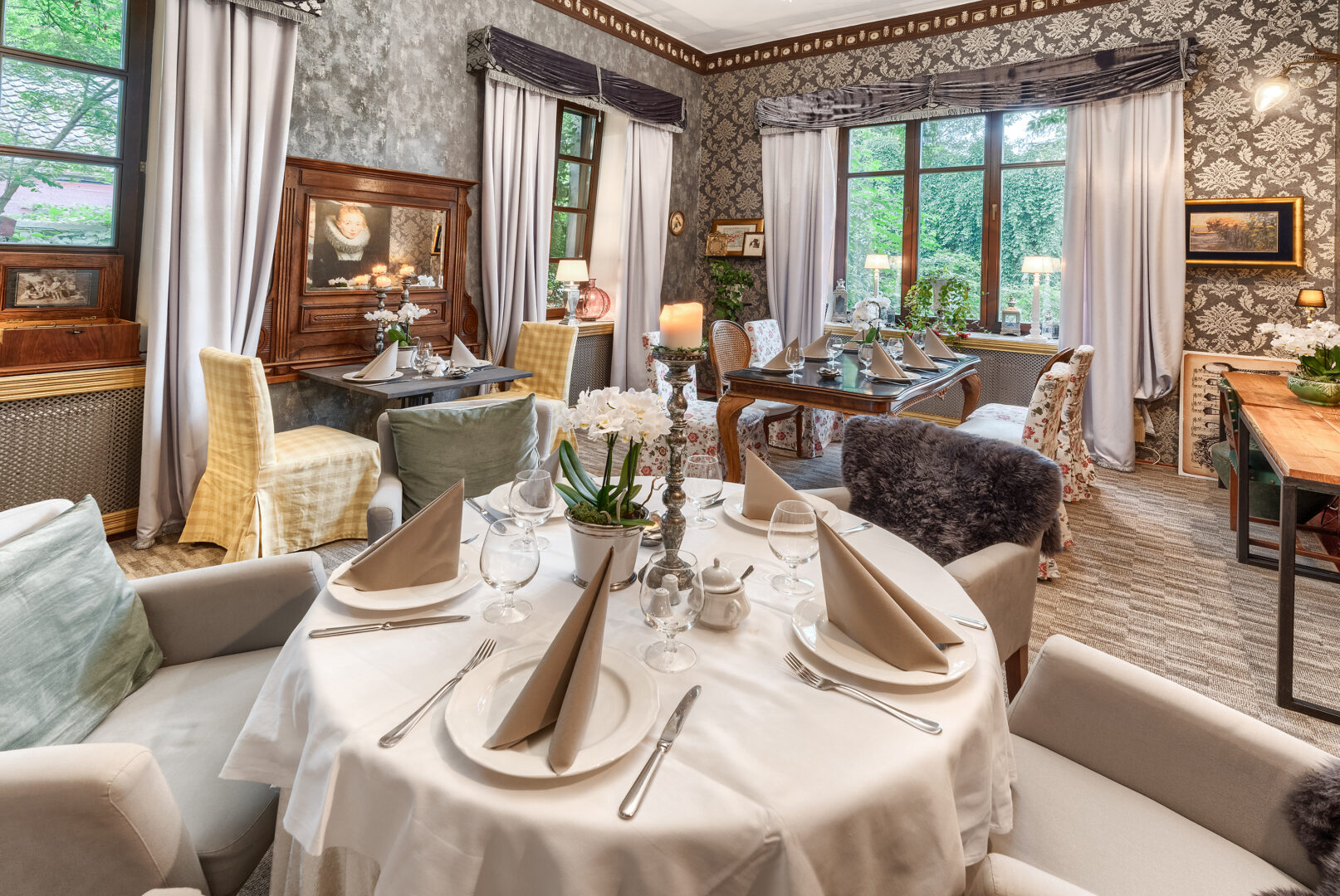 Dopełnieniem tej przestrzeni jest oranżeria, w której naturalne światło i otoczenie zieleni tworzą relaksującą atmosferę — doskonałą na popołudniową kawę lub mniej formalne spotkania.