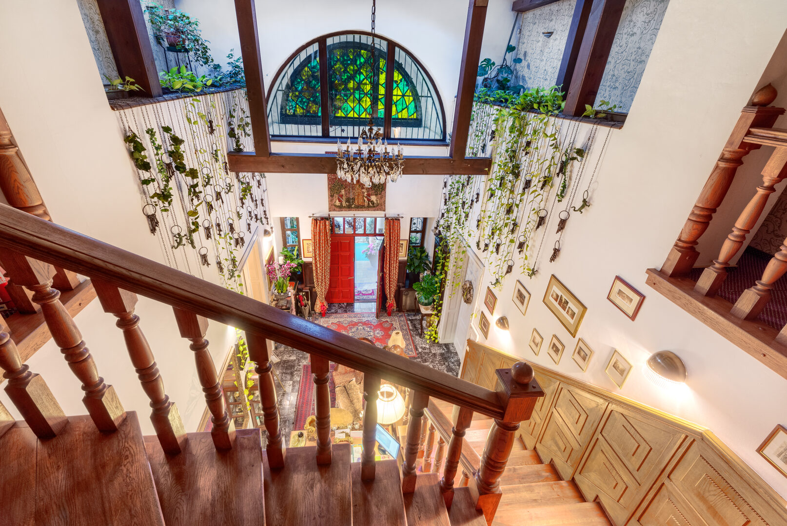 Wejście do budynku to reprezentacyjny, wysoki hol – za drewnianymi stylowymi schodami, które prowadzą na piętro do pięciu kameralnych pokoi hotelowych (2- i 3-osobowych), każdy z indywidualną łazienką. Układ pomieszczeń sprzyja przytulnej, rodzinnej atmosferze, a na parterze – tuż przy wejściu – znajduje się subtelna recepcja, idealnie wpisująca się w klimat tego miejsca.